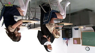Japanese black-haired lesbians Maki Hojo and Runa Akasaka enjoy massage and sex toys uncensored.