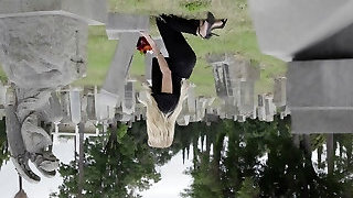 Couple of slim light-haired lesbo chicks are licking and fucking each other on the grass-plat near the building