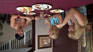 After noticing the brunettes massaging their boobs the all girl cougar teaches them everything in a threesome